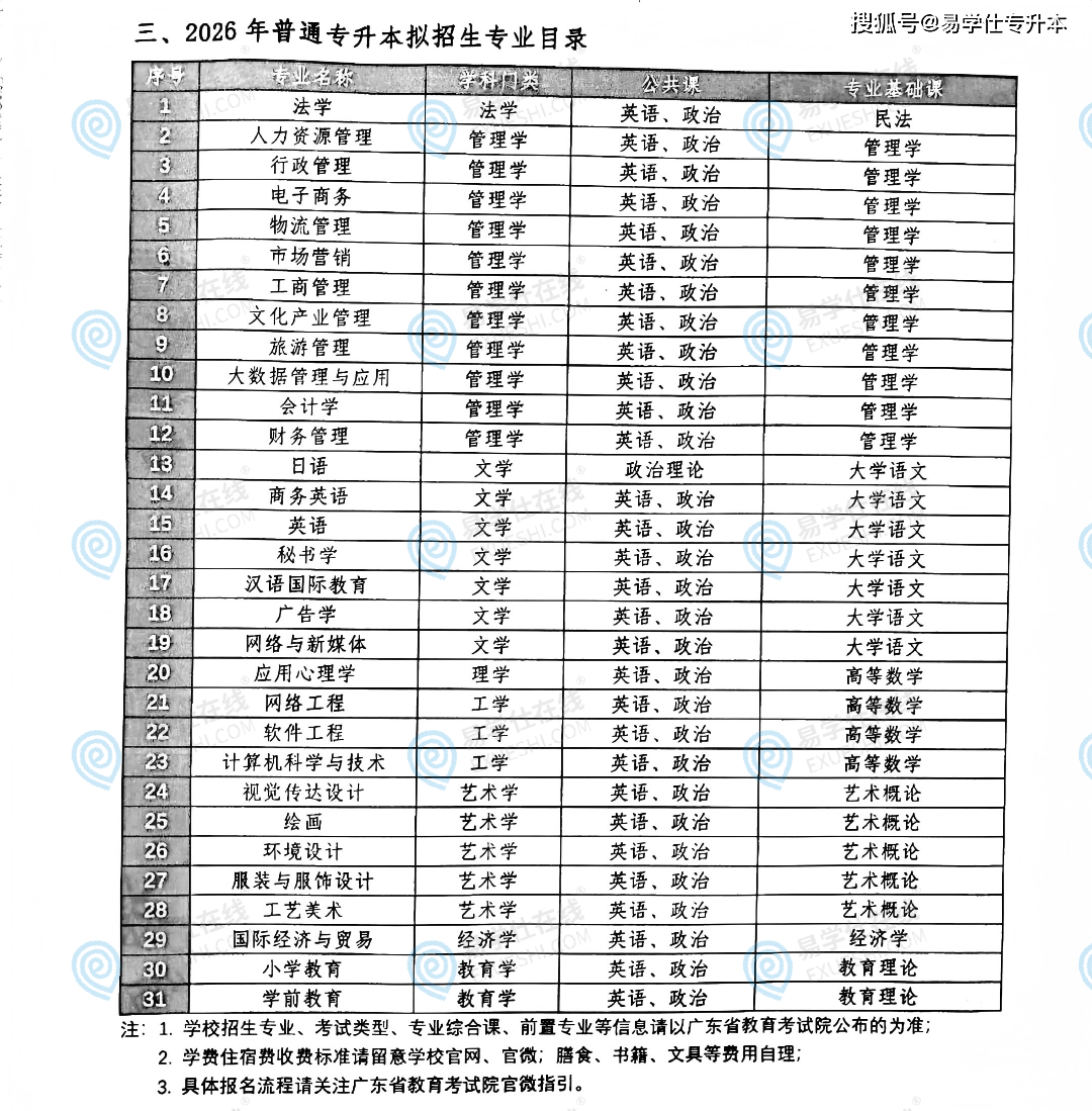 2026年广东专升本政策发布时间,涵盖、办理学、文学、理学、工学、艺术学、经济学、教育学。此中校考专业5个别离是:食物质量取平安、食物养分取查验教育、日语、跳舞编导、音乐表演。2026年通俗专升本(通俗批)拟招生专业共17个。