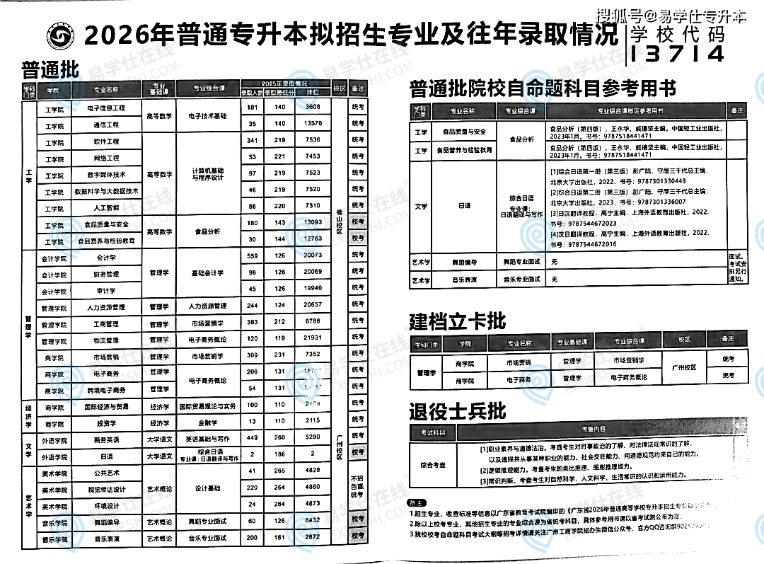 2026年广东专升本政策发布时间,涵盖、办理学、文学、理学、工学、艺术学、经济学、教育学。此中校考专业5个别离是:食物质量取平安、食物养分取查验教育、日语、跳舞编导、音乐表演。2026年通俗专升本(通俗批)拟招生专业共17个。